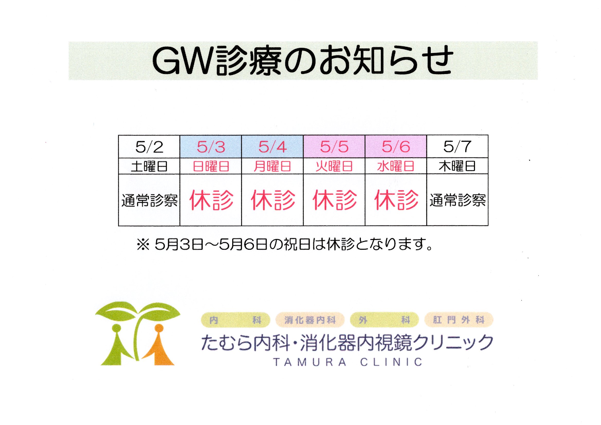 GWの診察について下記のとおりとなります。あらかじめご了承ください。